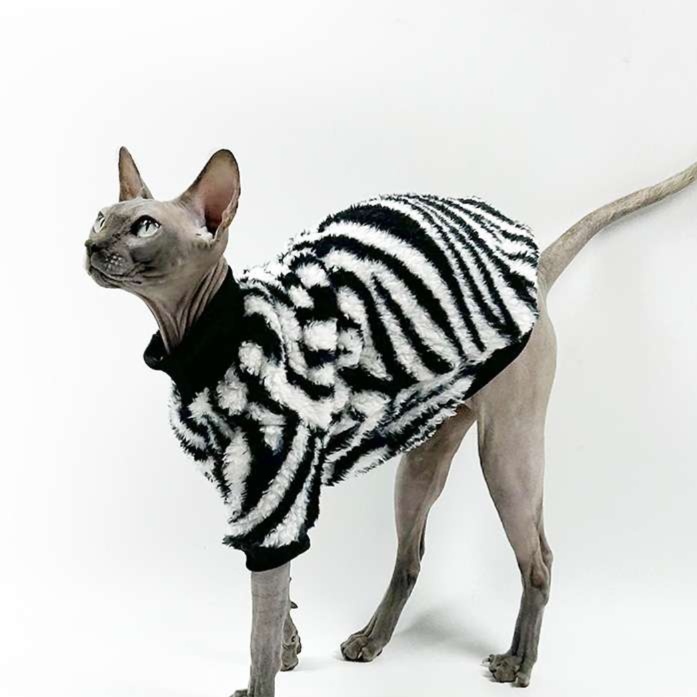 スフィンクス猫のための保温性抜群のウェア。体にフィットする設計で動きやすく、首元のハイネックが寒さから守ります。毛のない猫の体温調節をサポートする機能的なデザインです。